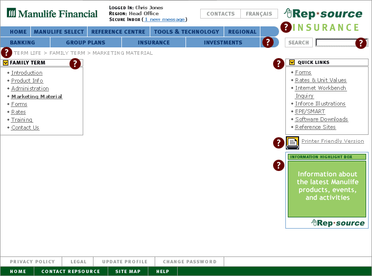![]() Move your mouse over the question marks on this page to learn about new features! Easier Navigation Public Content We've created a new page that you can see prior to login. This page provides access to information such as rates and general Manulife product news, and shows prospective users what's inside. It is still essential that you continue to login. All the Manulife tools and information you need to do business continue to be accessed only while logged-in. As before, login requires Repsource registration, user ID and password. Top Stories When you login, we'll continue to ensure you are up-to-date with our headline news, keeping you informed of all important Manulife product and company information, activity, events, changes, and fast-breaking stories as they occur. If you're not logged in, you'll see public news and information about products and relevant company and industry events. |